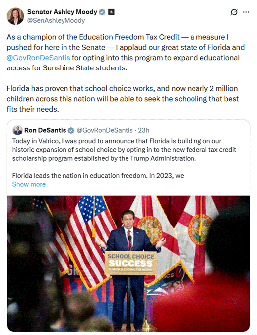 Additionally, Senator Moody applauded Governor Ron DeSantis’ announcement opting into the Education Freedom Tax Credit – a measure fought for and championed by Senator Moody via the Working Families Tax Cuts. See more below: